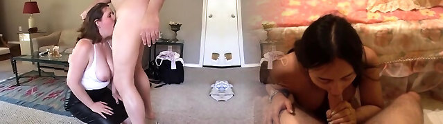Pallid old blondie kneels down to fellate huge orbs of fat brunette chick