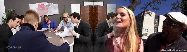 Mature blonde white woman in the company of black fellows