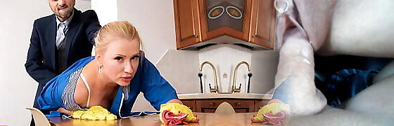 Mature blonde maid is dressed in uniform and fucking her employers son, because it feels so good