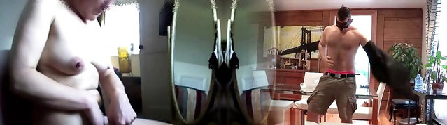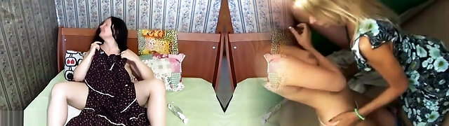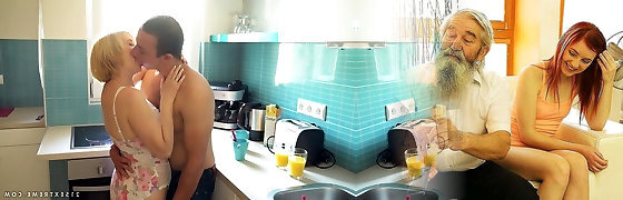 Hot granny fucking one black-haired wife with shaved pussy in kitchen