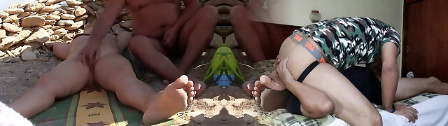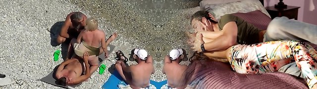 A spycam tapes swingers having a threesome at a nude beach