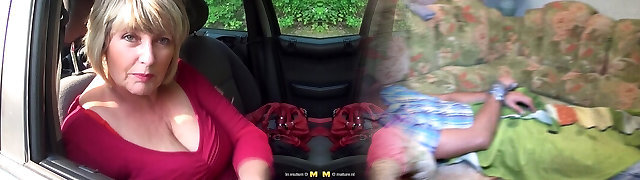 Mature Pauline thumbs her old pussy in a car and gets ravaged