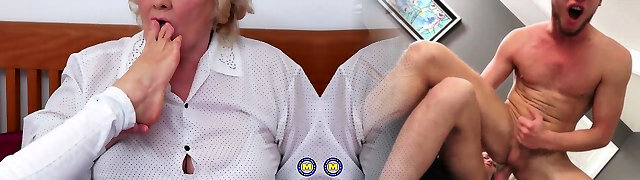 Enticing Gilf gives footjob to a young man