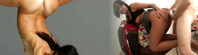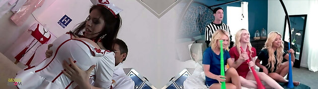 The doctor cheers up the brunette nurse with fake boobs by thrusting her with his big trouser snake