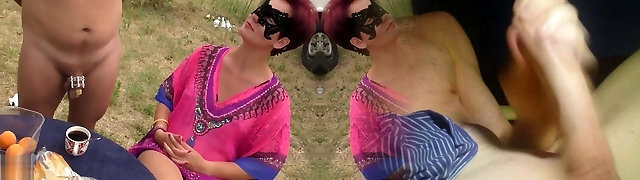 Horny mother-in-law eats jizm from fingers after handjob to son-in-law outdoors