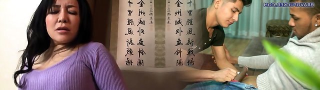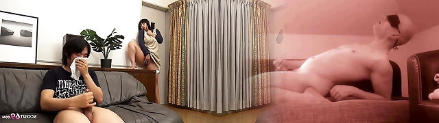 Asian Mature caught Young Guy Jerk with her Panty and help him with Blowjob