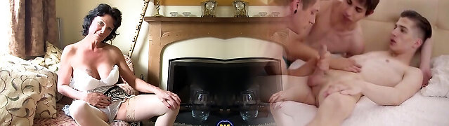 Milf catching stepson in his panties and jerks him until cumming all over himself