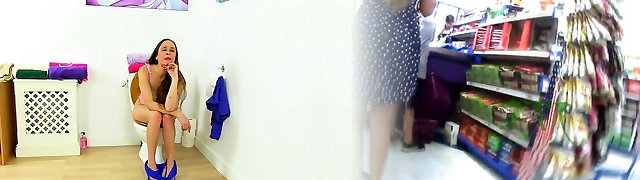 Woman pees hard in restaurant wc